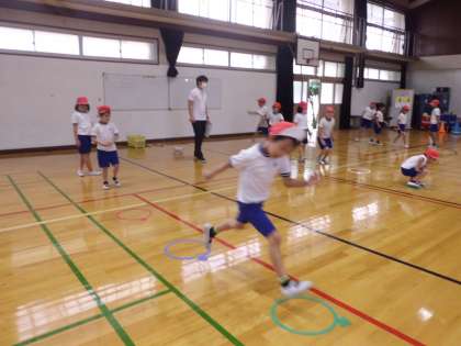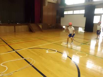 今日の学習では,5歩目で宝島(縄跳びで作った島)にたどり着く遊びをしました。「うでをつかうと遠くにとべた。」「ひざを曲げると宝島についた。」と言う楽しそうな声が聞こえてきました。