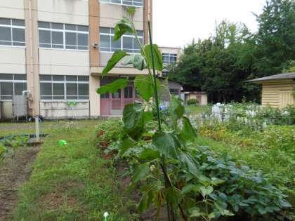 学校園で育てているホウセンカやヒマワリ,ダイズ,オクラが順調に育っています。ヒマワリは,およそ1m80cmになり,花のつぼみが見られます。オクラには大きな実ができていました。実の中に何ができるのか,学習していきます。