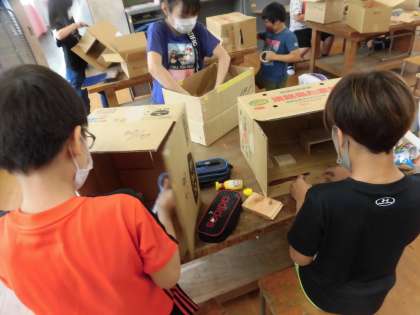 図工の「のぞいてみると」に取り組んでいる様子です。箱をのぞくとどんな世界が広がっているか想像しながら,作り始めました。一人一人が思いをこめて一生懸命作っています。どんな作品が完成するか楽しみです。