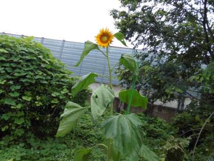 ついに,ヒマワリの花が咲きました。高く伸びて大きな黄色い花を咲かせています。