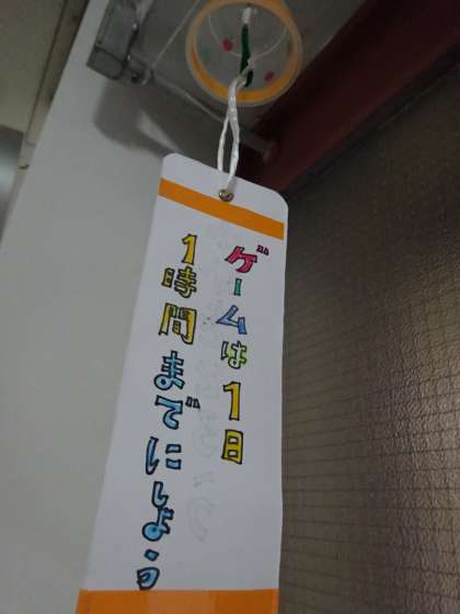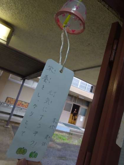 ライフ委員会では,みんなが健康で元気に生活できるにはどんなことに気をつけるとよいのかを話し合い,まとまった意見を短冊に書き,風鈴のようにしてつるしました。