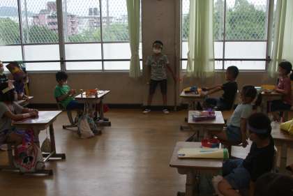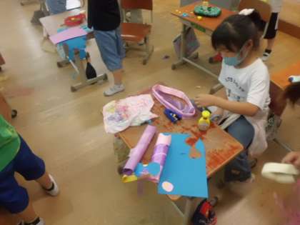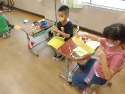 図画工作の学習では,色の組み合わせを考えながら画用紙でわっかを作り,身に付けて変身しました。画用紙と輪ゴムを上手に使い,頭や腰にピッタリ合うようわっかを作り,かざり付けをしました。それぞれ個性豊かな作品が出来上がりました。最後にはみんなで,ファッションショーを行いました。