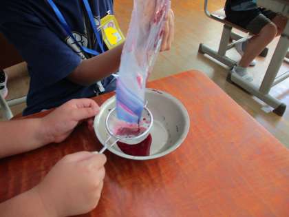 夏休み前,そして夏休み中に冷凍保存していたあさがおの花を使って,色水づくりをしました。