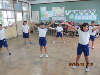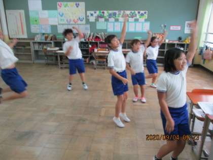 体育ではリズムダンスに取り組んでいます。初めは,恥ずかしそうに踊っていた子どもたちも,練習を重ねていく内に,曲にのって体を動かせるようになってきました。みんなで一緒に踊るところがお気に入りのようです。