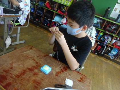 家庭科の学習で,針と糸を使って手縫いに挑戦しています。