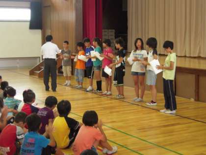 7月の児童朝会を行いました。朝会が始まるまでに全校合唱で「Smile Again」を歌いました。各学級,学年で歌の練習をしていることもありきれいな歌声が体育館に響いていました。