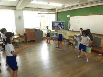 体育参観日の最後に全校ダンスがあります。その全校ダンスの練習をみんなに教えるために一生懸命練習を始めています。みんなが楽しく踊れるようにノリノリで踊っています。全校のみんなで楽しく踊りましょう!