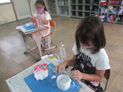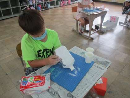 「空きようきのへんしん」では,紙粘土を使って,空き容器を変身させました。