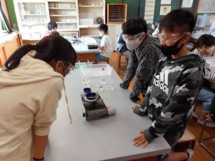 水よう液の扱い方を確認してから,5つの水よう液(食塩水・炭酸水・石灰水・アンモニア水・塩酸)の見た目やにおいを観察し,それぞれの水よう液を熱して何が残るかを実験しました。