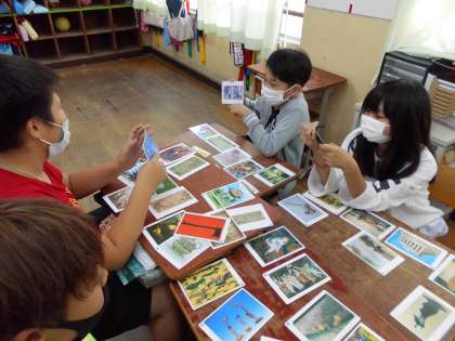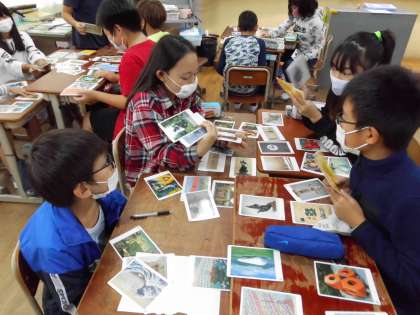 図工で「カードを使って」の学習をしました。アートカードという様々な芸術作品が描かれたカードを机に並べ,その中から自分がお題に合っていると感じたカードを選び,グループの友達に紹介しました。お題は毎回担任が引きました。「やさしい」「ひそひそ」などいろいろなお題が出て,子どもたちはそれぞれが思い思いにカードを選び,理由を友達に発表していました。