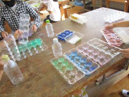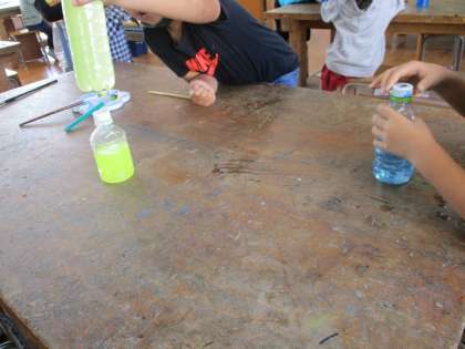 使う絵の具の色や絵の具の量によって,いろいろな色水ができることに子どもたちは大喜び。
