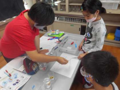 リトマス紙を使うと,酸性,中性,アルカリ性の3つに仲間分けできることを確認してから,グループごとに実験を行いました。