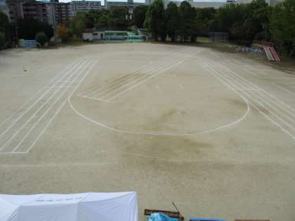 登校してきた子どもたちは,白線が引いてある運動場を眺めながら,