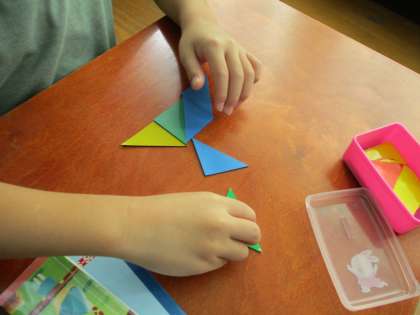 三角の色板をクルクルと向きを変えながら,どことどこをくっつければいいか,考えながら形を作っていきました。