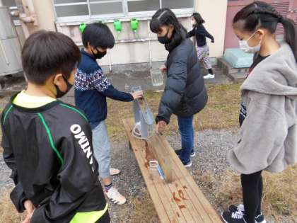 今日は,地層のでき方について道具を使って実験をしました。