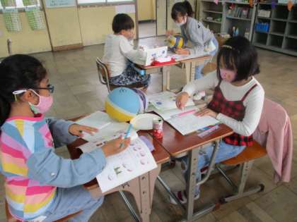 算数「円と球」では,自分たちの身の回りにあるまるい形をしたものを調べ,分類しました。ドッジボールや野球ボールは上から見ても横から見ても丸いことや,球を切った切り口は円になることを学びました。