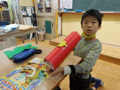 図工でゴムの力で走る車を作りました。でも,車だけでなく,船やバス,中には犬を作った子どもも。ゴムをまいて走らせると,進んだり戻ったりとおもしろい動きをします。作るのも楽しかったのですが,出来上がった作品でたくさん走らせて遊ぶことができ,とても満足そうでした。