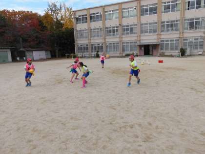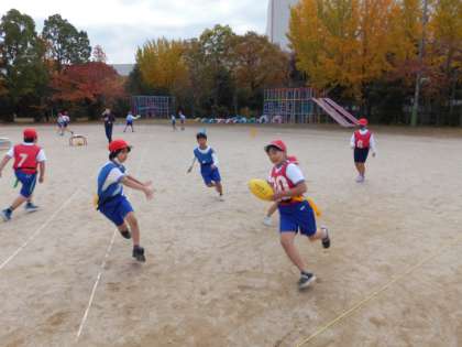 4年生は,体育でじんとりゲームをしました。左右の腰にタグというビニールの帯を着けて,ラグビー型のボールを持って,敵陣のゴールラインを走り抜けたら得点できるというゲームです。タグラグビーのルールをもとにしているため,前に向かってパスができないので,戸惑っていましたが,だんだん慣れてきて,勢いよくゴールラインを走り抜ける人も見られるようになってきました。