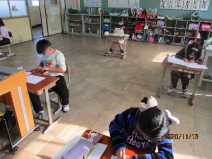 毎週月曜日は漢字テストをしています。先週一週間,宿題で書き写したドリルの内容がテストに出ます。めざせ100点!”