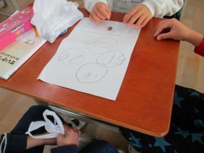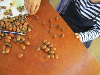 どんぐりでボーリング,15秒でどれだけどんぐりを立たせられるか,落ち葉でお面づくり,落ち葉で模様写しなど,いろいろな遊びを考えていました。