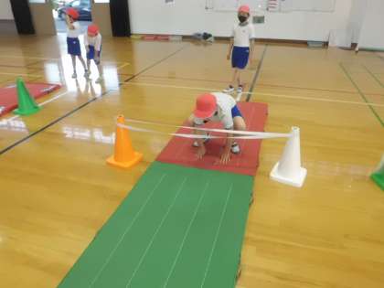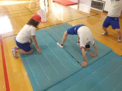 体育では,マット遊びの学習をしています。坂の場や長い場で様々な遊びに挑戦しています。みんな楽しんでマット遊びに取り組んでいます。
