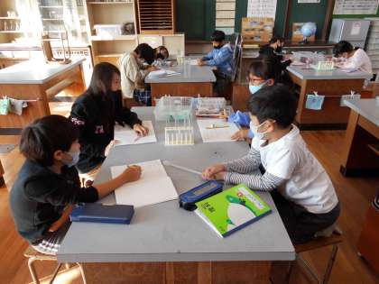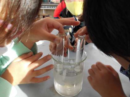 水を温めたり冷やしたりすると体積がどうなるかを調べました。試験管に水を満たして,氷水につけて冷やしたり湯につけて温めたりして体積の変化を調べました。水面の高さに目を下ろして,水位の上下を注意深く観察し,分かったことを話し合っていました。