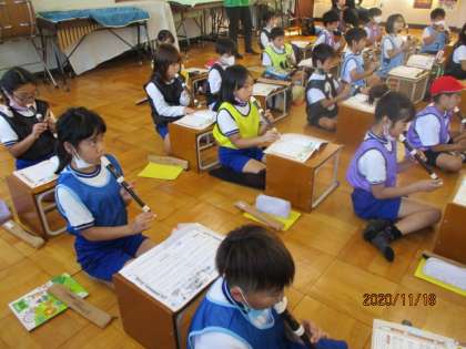 小栗栖小学校との合同学習の音楽の時間には「パフ」をリコーダーで演奏しました。