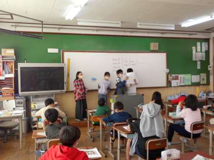 先生にインタビューした後にクイズを作成しました。まずは,先生の顔の絵やできること・できないことの絵を描いて答えを作りました。その後,クイズを出す練習をしました。そして,一班ずつクイズを出しました。他の班は「He can run fast.」などの3〜4つのヒントをもとに考えました。とても楽しそうに活動していました。