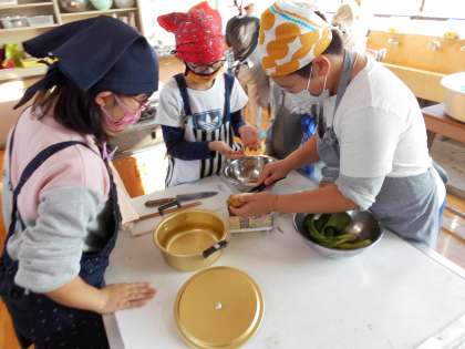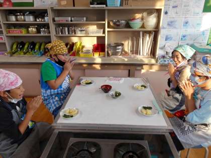 家庭科の「おいしい楽しい調理の力」の学習で食品をゆでるとどうなるかを調理実習をして確かめました。今回は小松菜とじゃがいもをゆでて,色合いやかたさなどの違いを比べてみました。初めての調理実習に戸惑っている部分もありましたが,安全に気を付けながらも楽しんで活動していました。調理終了後,試食しました。「小松菜のかさがすごく減っている」「じゃがいもがやわらかくなっておいしい」とゆでるとかさが減ったりやわらかくなったりすることに気付いていました。次回はゆで野菜のサラダを作る予定です。