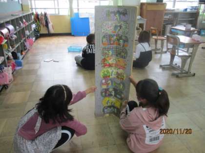 それぞれの係の仕事を全うしています。本係は読み聞かせの練習を。かざり係は教室に折り紙の家や人の飾りつけを。ダンス係と遊び係の活躍も期待しています!