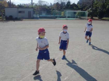 体育では,ゆっくりかけあしの学習をしています。ねらい1では,みんなでペースを合わせて走ります。ねらい2では,自分のペースで走ります。走ることに気持ちよさを感じながら,一生懸命走っています。