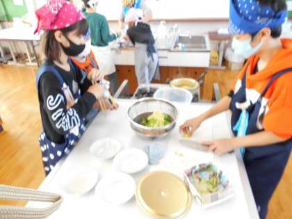 家庭科の「おいしい 楽しい 調理の力」でゆでる調理の学習をしています。今回は調理実習でゆで野菜サラダを作りました。2回目の調理実習だったので,準備や片付け,調理の分担などスムーズに行うことができました。しっかりゆでられて,野菜がほどよいかたさになっている班ばかりでした。成長です!