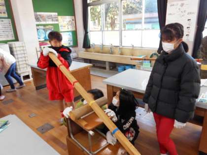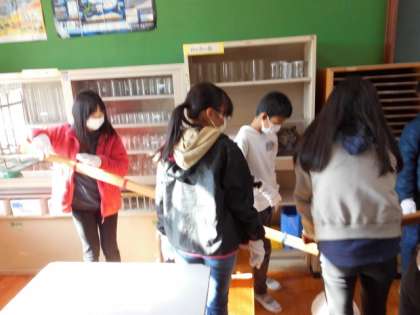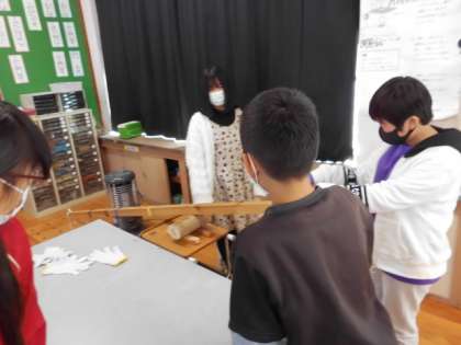 授業の後半には実際におもりや角材を使用して,てこの実験器を作り,手ごたえなどを確かめてみました。