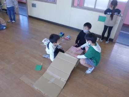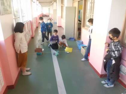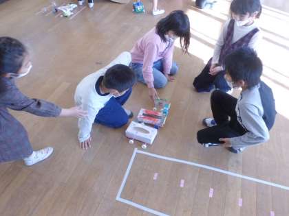 今まで準備をしてきた動くおもちゃを使った遊びに,1年生を招待しました。動く車やゴムを使ったロケットを使った遊びで,1年生を楽しませることができました。写真は,車を使って遊んだ3グループです。