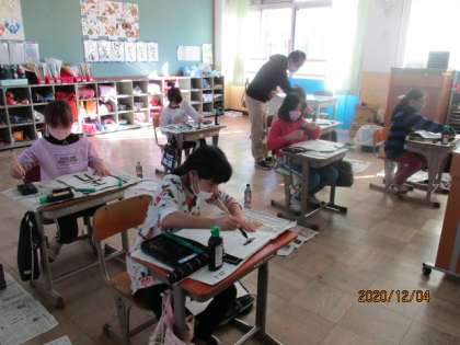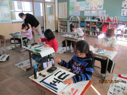 書きぞめ「正月」を書きました。横画,たて画,たて画,左はらいに気をつけて書いています。「書きぞめ」の意味についても学習しました。