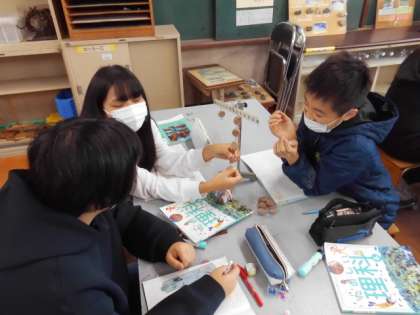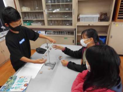 おもりをてこに付けて垂らしていき,どちらにかたむくのかを予想しながら,学習を進めていきました。
