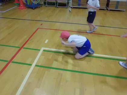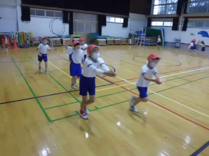 体育では,スイミーのお話に出てくる生き物になりきって表現する学習をしています。楽しいスイミー,寂しいスイミー,おもしろい生き物になりきって,楽しく学習することができました。これからもいろいろな面白い動きを見つけていきたいと思います。