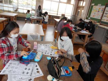 月に1回のクラブ活動で,手芸・工作クラブではいろいろなものを作っています。今回はマスコットを作りました。好きな動物の型をとってフェルトを切取り,縫っていきます。4年生は初めてなので,6年生が手伝ってくれました。ペンギンやキツネ,パンダなど個性豊かな作品ができ上っていました。