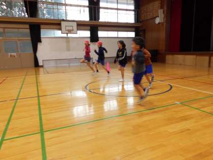 3学期はじめての体育。今日は雪が降ったので体育館で行いました。