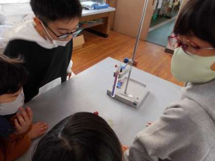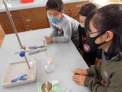 理科では,「もののあたたまり方」について調べています。今日は,水のあたたまり方について,サーモテープを使って調べました。下を温めているのに,上のほうから色が変わってくることに「なんでやろう。」「もう一回調べよう。」など言いながら,調べていました。