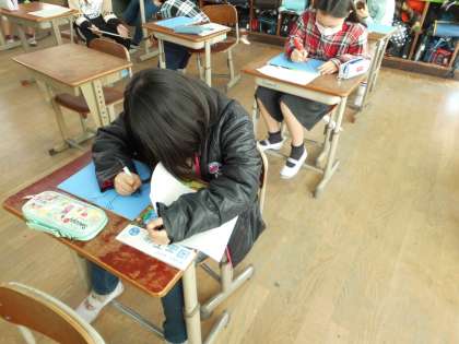 図工の「ほり進めて刷り重ねて」の学習で彫り進み版画をします。テーマを「夢の楽園」としました。自分の思いえがく夢の楽園には,どんな素敵な景色が広がっていたり,どういう動物や植物がいるかを一人一人考えました。自分のイメージしたものを板に描きました。そんな素敵な作品になるでしょうか。