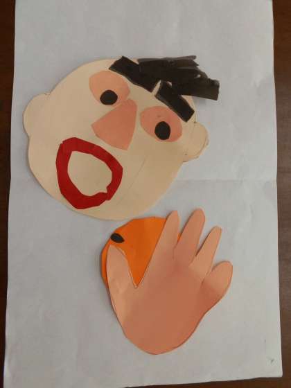 自分がすきなものを食べている顔を紙版画の版にしてみました。わかりやすく色画用紙を使って作りました。できた版を紙の上に配置してみました。このあと,版画インクをつけて刷るので真っ黒になってしまうのでその前に。なかなかすてきですよね。