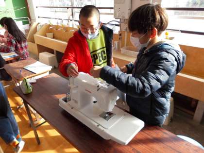 ついに初めてミシンを使ってみました。最初は,ミシンを使う時の注意点や安全な運び方などを確認しました。その後,グループでミシンを実際に見ながら,各部分の名前を確認したり,電源の入れ方を一人ずつやってみたりしました。初めてミシンに触る人もたくさんいて,楽しそうでした。次の時間は針をつけてみます。