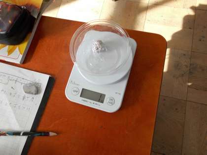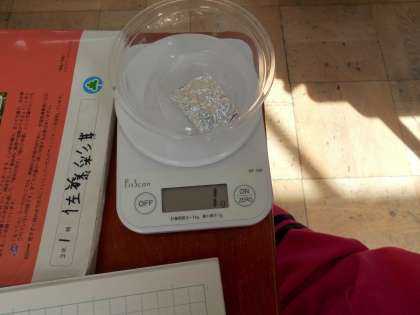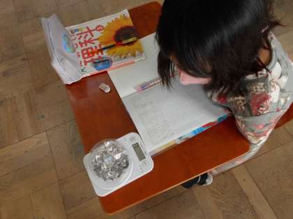 はかりを使って,ものの重さをはかっています。形を変えると重さはどうなるか調べました。アルミホイルを使って,元の重さと,固めた時の重さやちぎった時の重さを比べました。重さは,変わらないことが確かめられました。