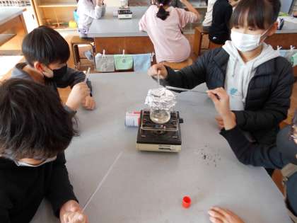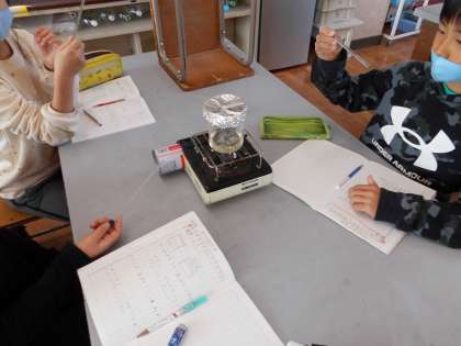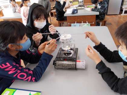 入れものに入れた水を置いておくとかさが減ることを1学期に学習しました。その時に,暖かいところの水が早く減ったことから,水を温めてみるとどうなるかを調べました。沸騰している水のようすを観察したり,ふたのすき間から出てくる白い湯気にガラス棒を近づけてみて,水であることを確かめていました。