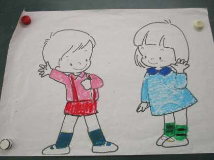 まず,男の子と女の子の服に色を塗った子どもたち。