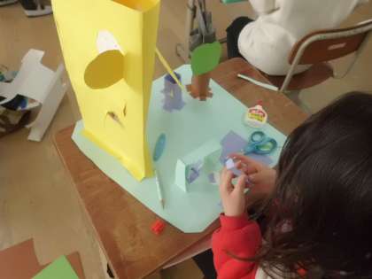窓を作り終えたので,建物を建てました。その周りにも様々なものを作り,楽しく活動しています。図工展に展示しますので,楽しみにしていてください。