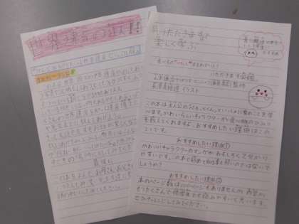 国語の「この本 おすすめします」の学習で,低学年や中学年の人に今まで読んだ本の中から推薦したい本を選び,推薦する文章を書きました。今回は前の時間に下書きしたものを,より相手に伝わりやすいように考えて清書しました。