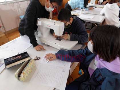 家庭科の「ミシンにトライ!手作りで楽しい生活」の学習で,今回は下糸を巻いて,下糸をセットする練習をしました。グループのみんなと相談しながら下糸を巻いたり,悪戦苦闘しながら下糸をセットしていました。