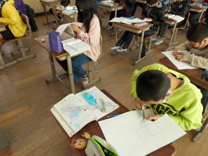 算数の「角柱と円柱」の学習で,今回は角柱の展開図をかいて,角柱をつくりました。底面と側面を工作用紙に書いて,最後は切ってみて角柱を組み立てました。「うわっ!三角柱になった!」と喜んでいました。